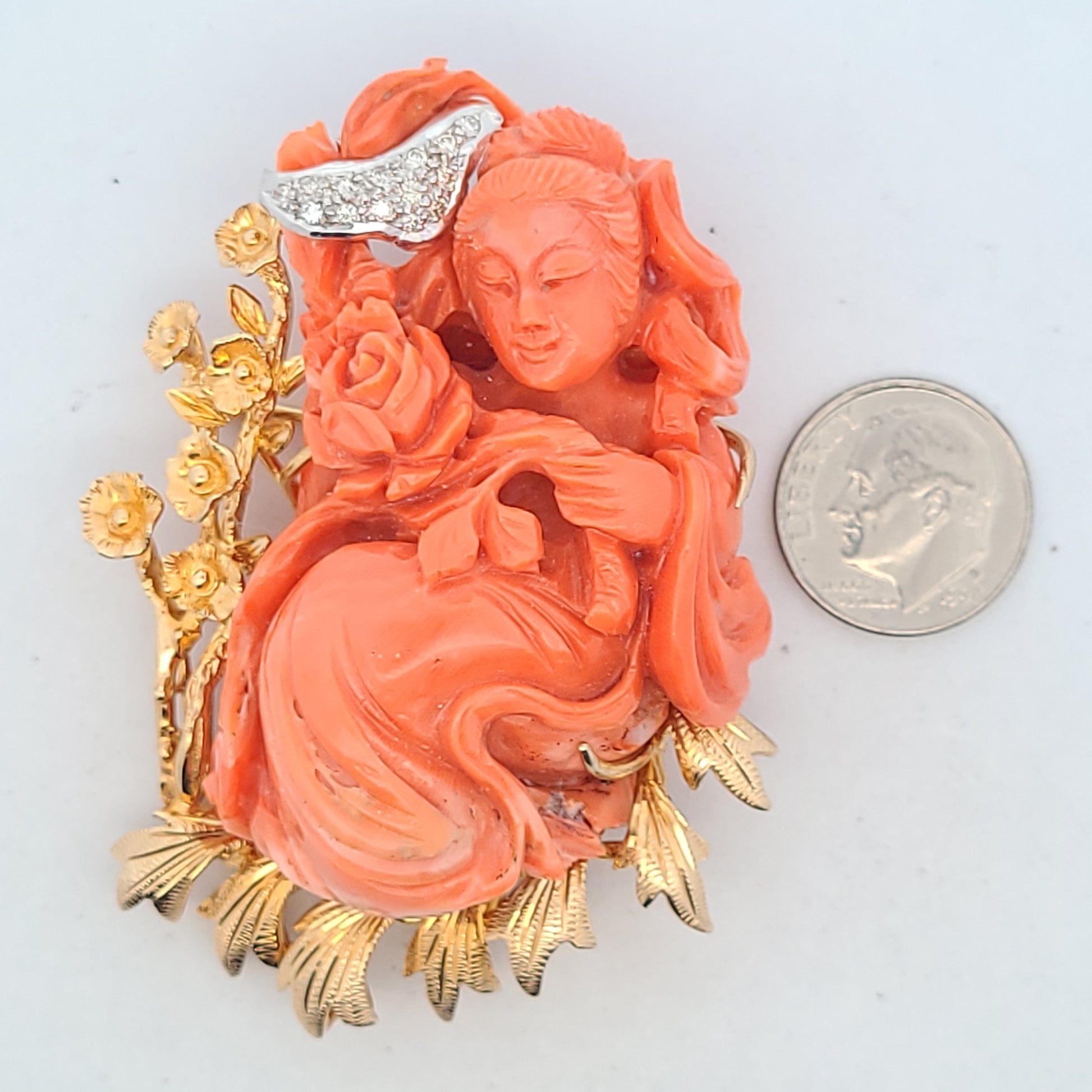 14K Yellow Gold Diamond & Carved Coral Lady With Flowers Brooch