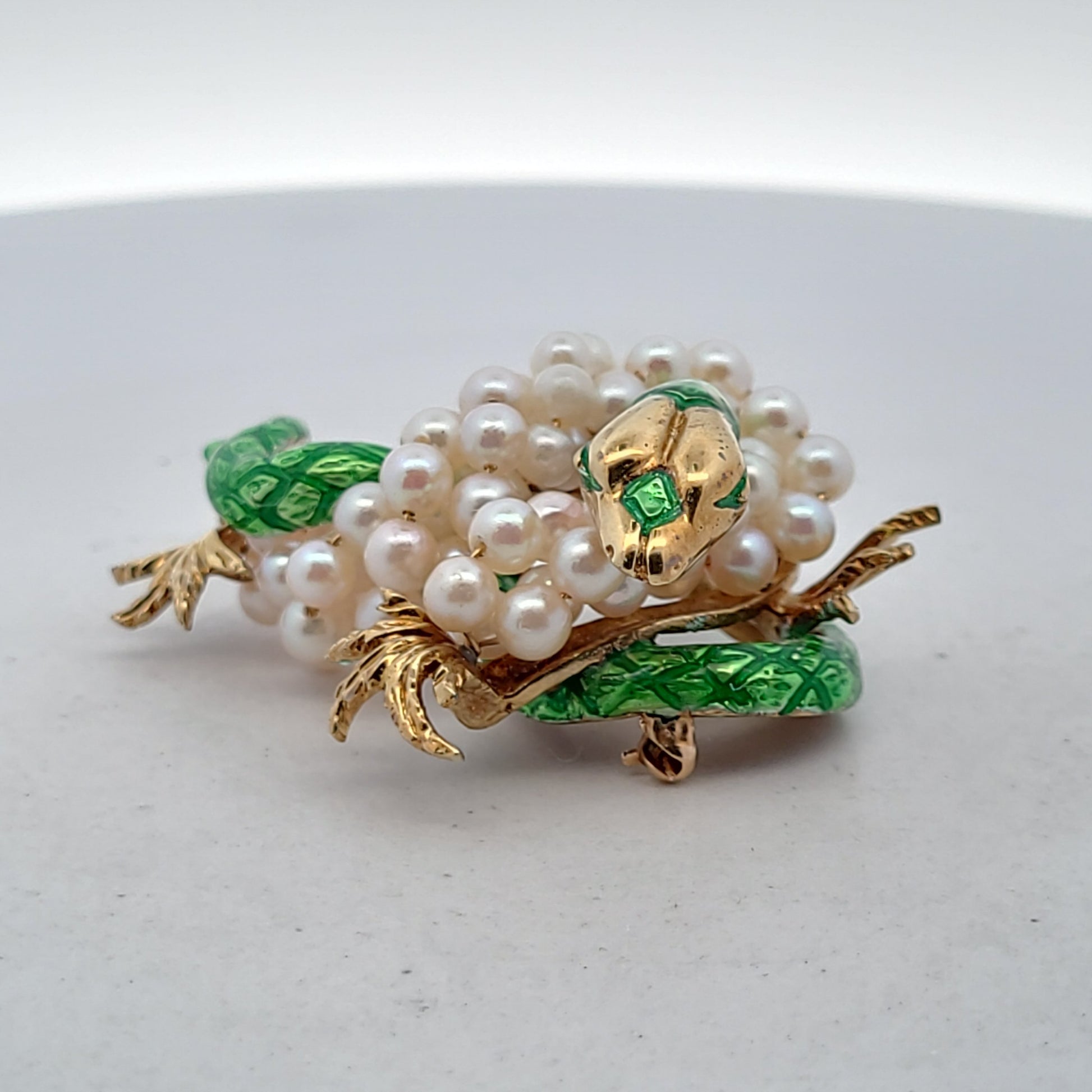 14K Yellow Gold Green Enamel Cultured Pearl Dragon Brooch