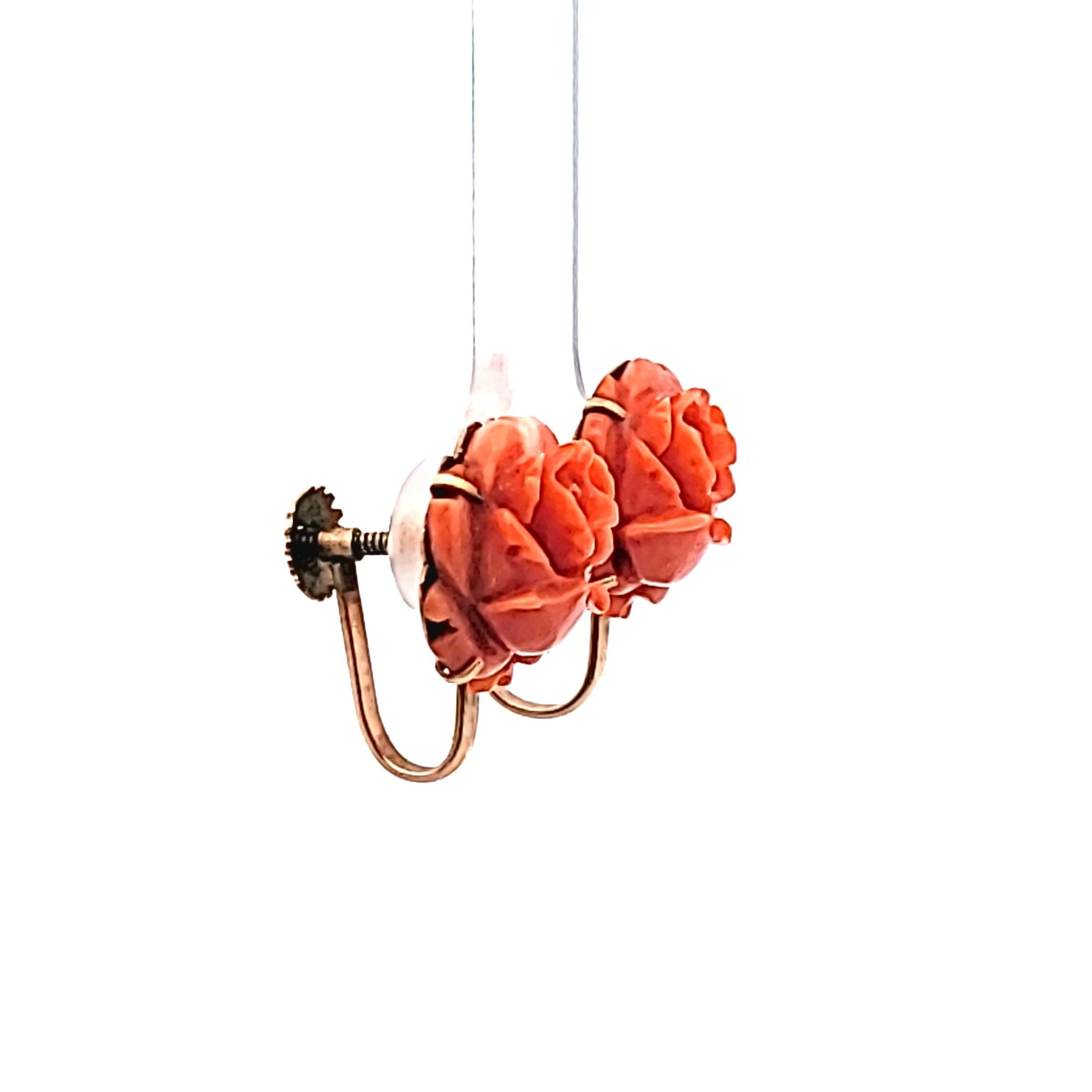 Antique 9K Yellow Gold Carved Coral Rose Screwback Earrings