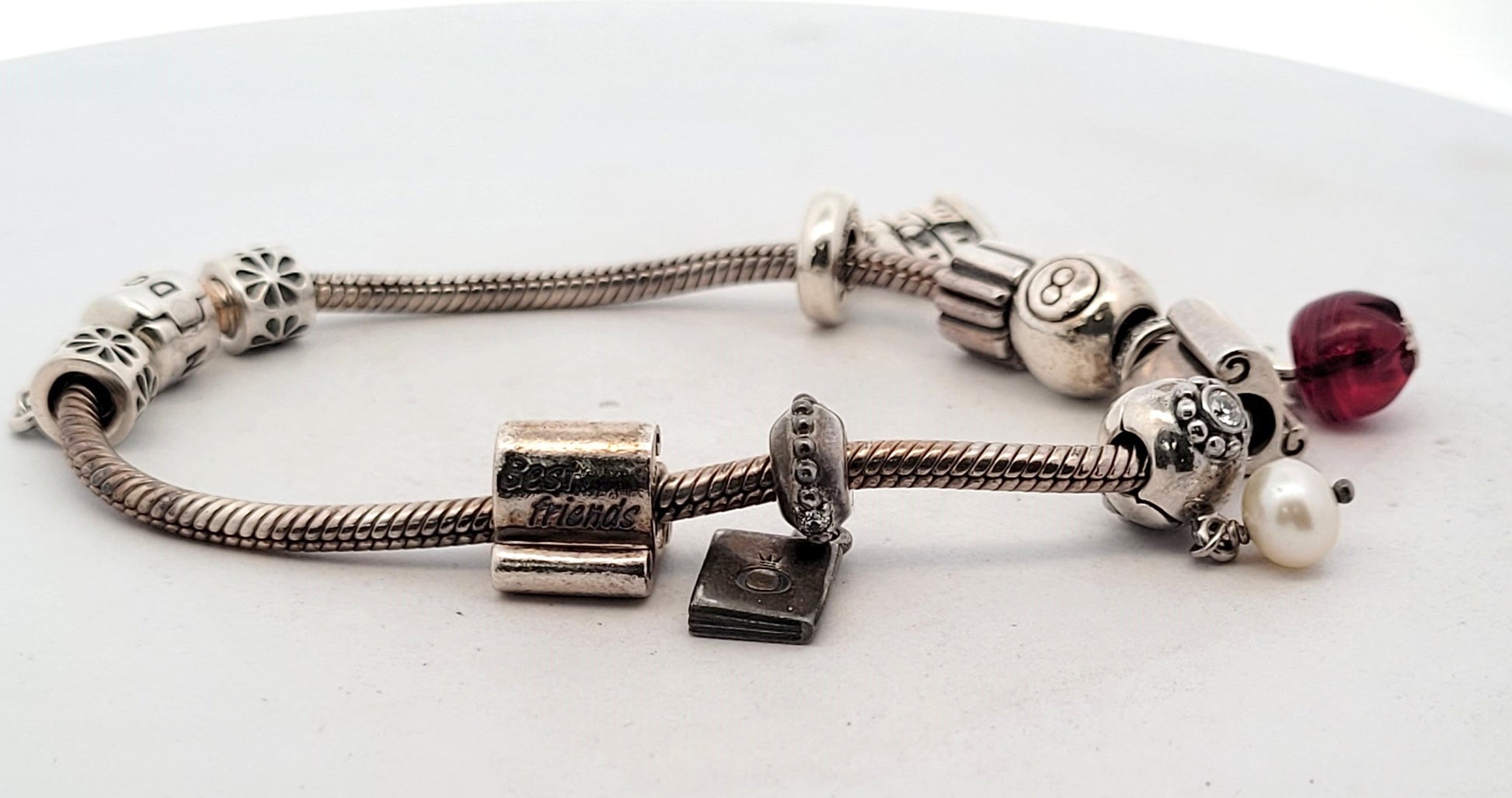Unique individual charms: 8 ball, red glass apple, (2) best friends charm, CZ & faux pearl charm, passport charm, Roman colosseum charm, double chain charm & Pandora clasp charm