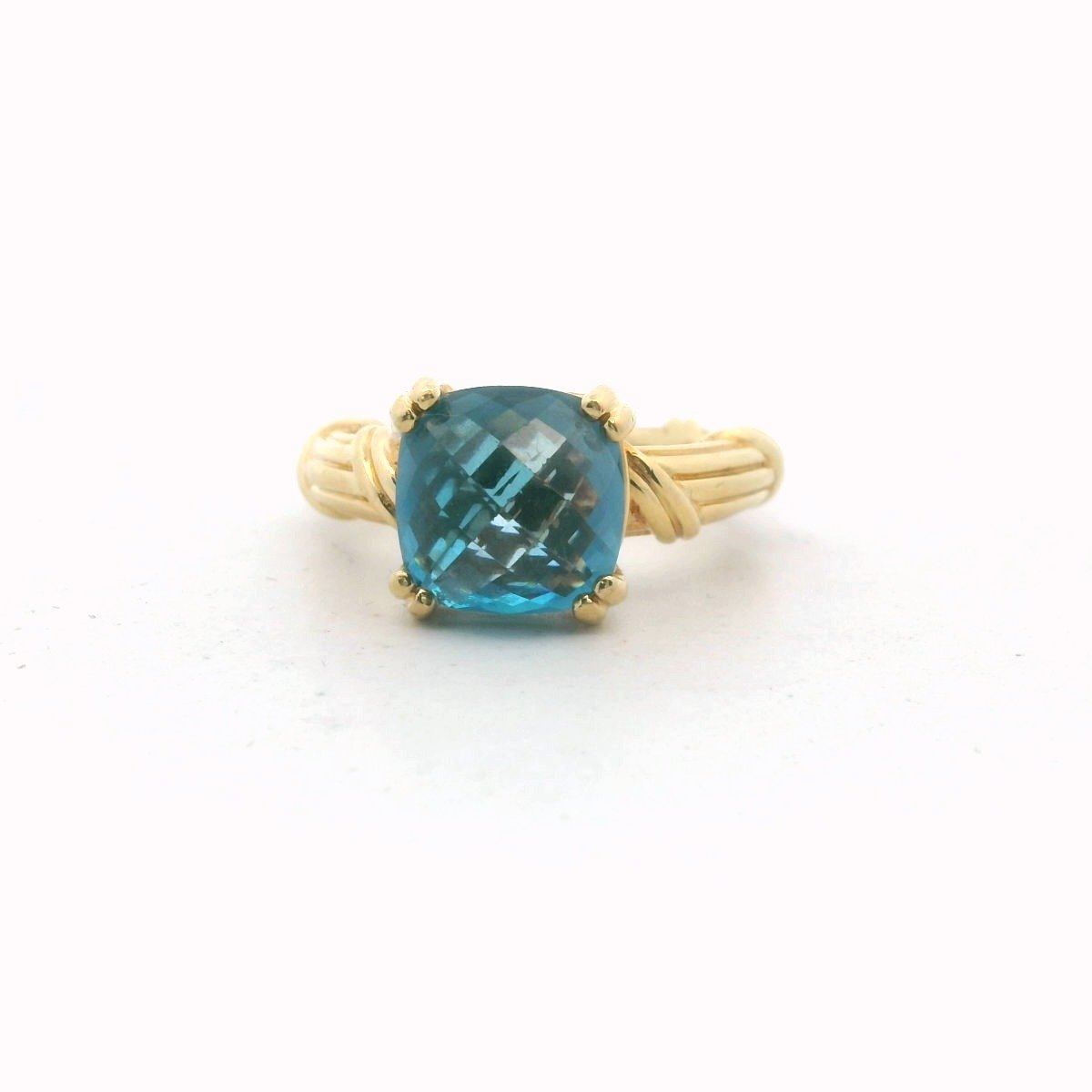 Ring contains one checkerboard cut London blue topaz gemstone