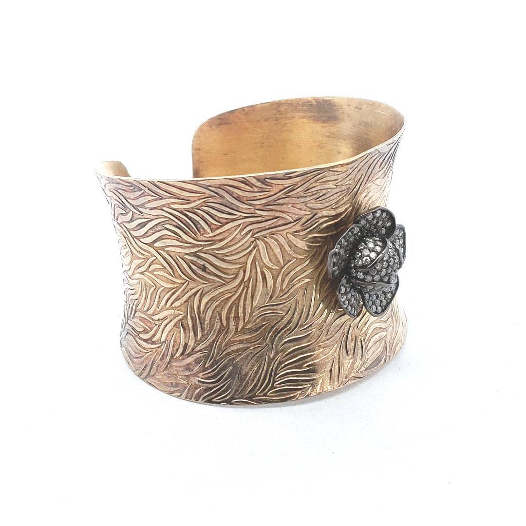 Sterling Silver Pave Set Diamond Rose Textured Cuff Bracelet