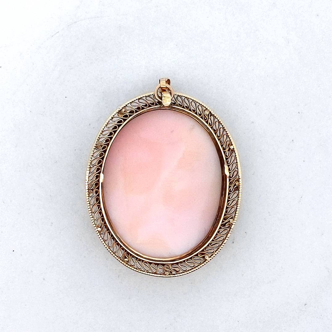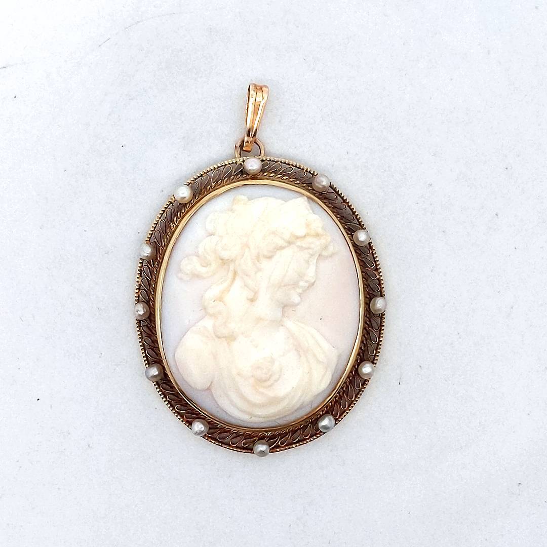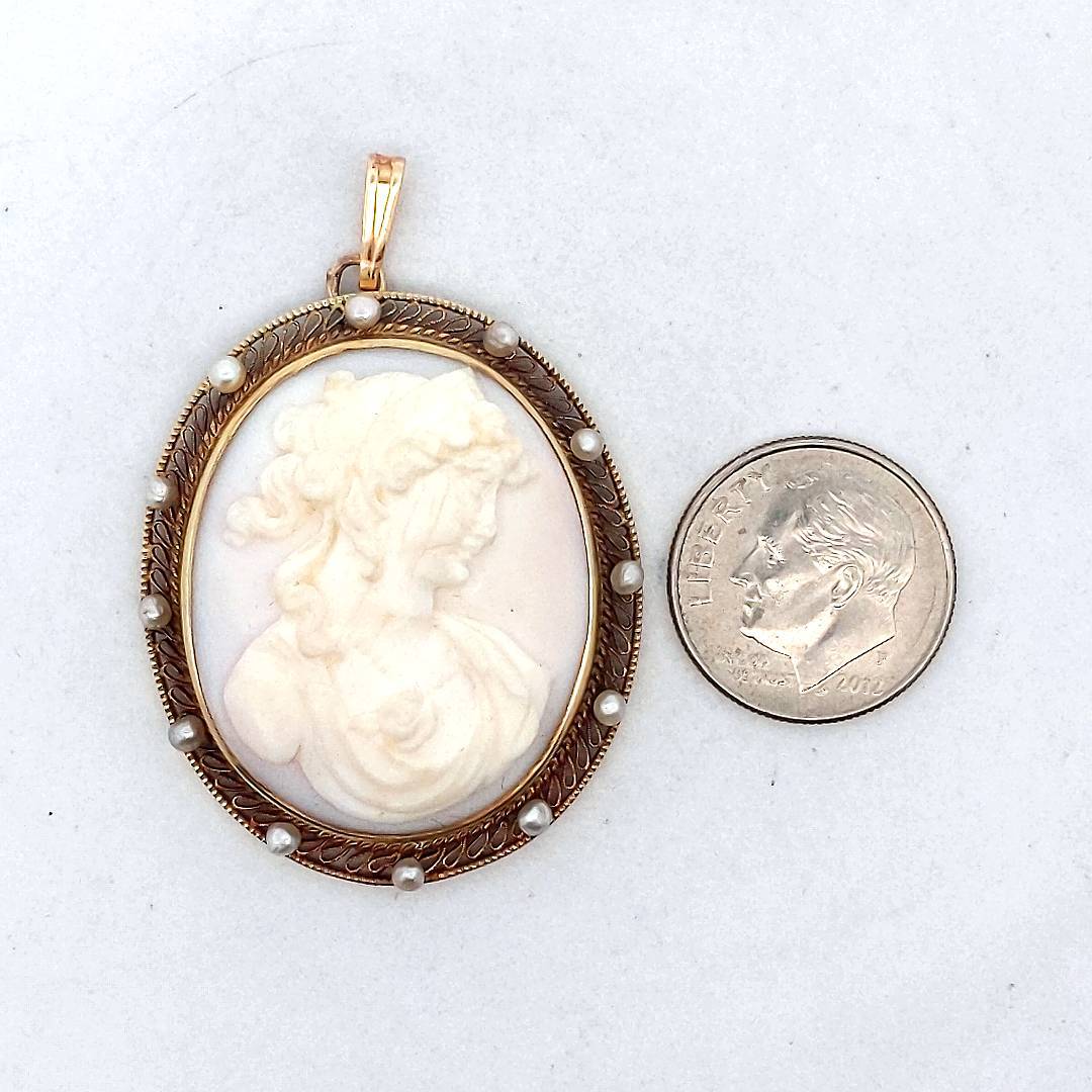 Vintage 14K Yellow Gold Carved Shell Cameo Natural Pearl Pendant